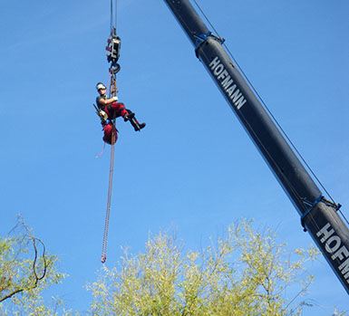 Durch die stückweise Fällung der Baumteile und den Einsatz von Abseiltechnik arbeiten wir besonders sicher, auch an schwierigen und abgelegenen Standorten. Bei Bedarf arbeiten wir auch mit einer Hubarbeitsbühne oder einem Autokran.