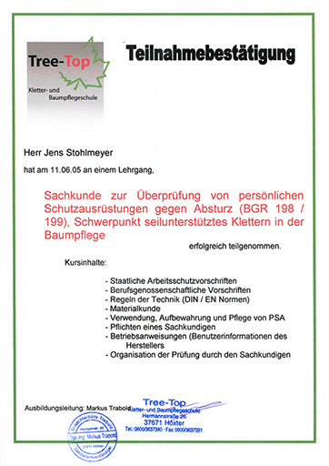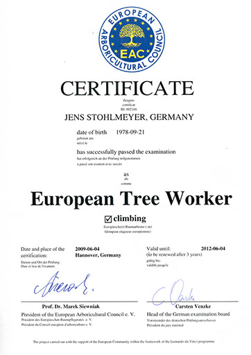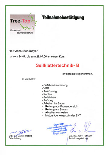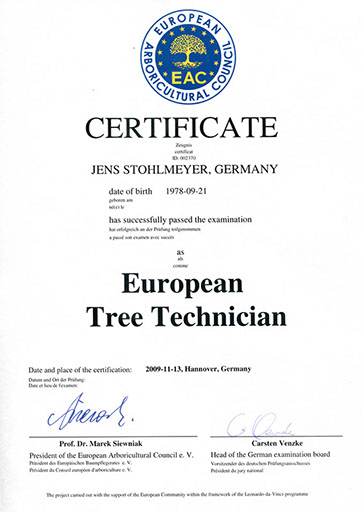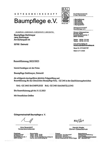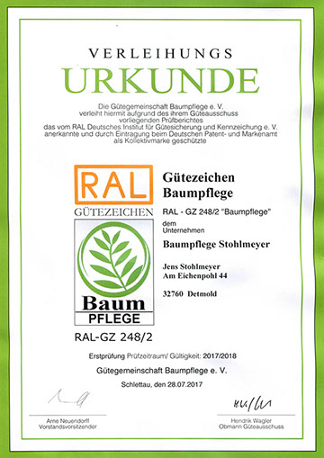 Wir haben uns von der Gütegemeinschaft RAL-Baumpflege zertifizieren lassen, um die Qualitätssicherung in unserer Branche zu forcieren. Es gibt zwar Bestrebungen, die Qualität der Baumarbeiten zu definieren, diese sind jedoch noch nicht ausreichend und transparent genug. So ist die Zusammenführung der vielen Regelungen zu einem Regelwerk der Gütebestimmungen das anvisierte Ziel. In den Richtlinien der RAL-Baumpflege werden die Qualitätsanforderungen wie fachgerechte Schnitttechniken, die Verwendung von ökologischen Betriebsmitteln oder auch die Sicherheit und Organisation von Arbeitsabläufen zusammenfassend festgelegt.