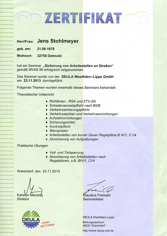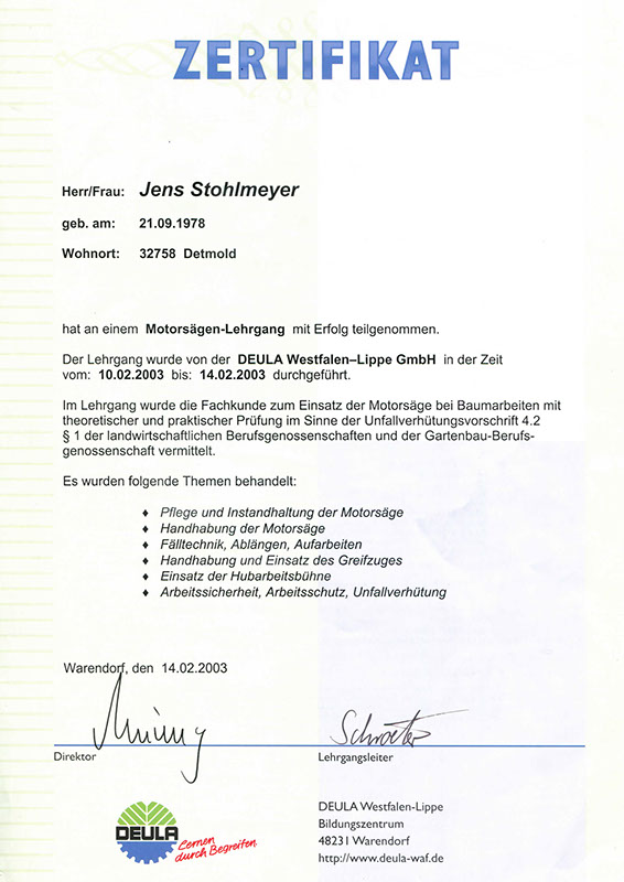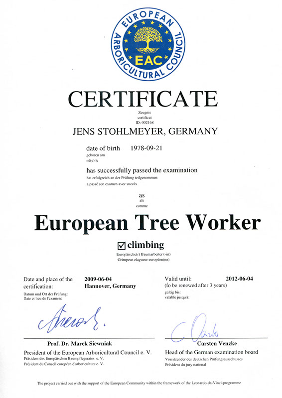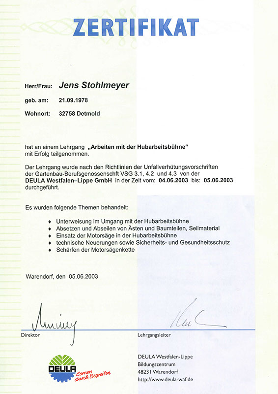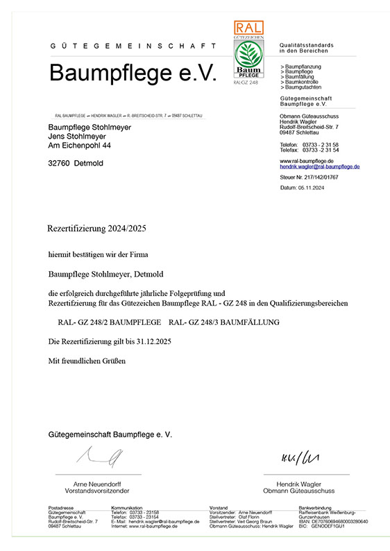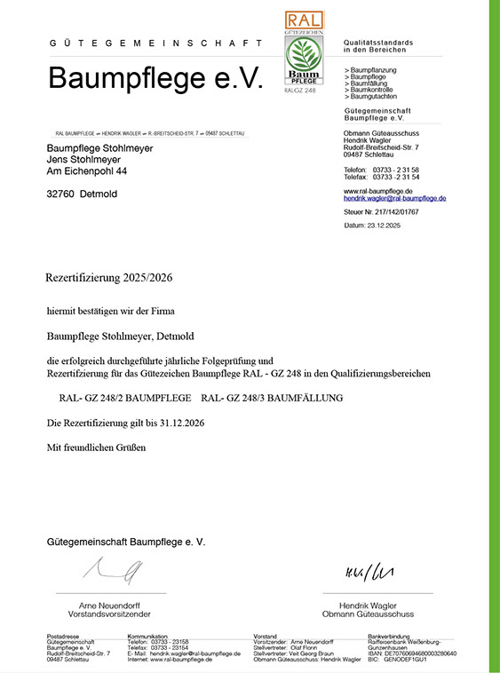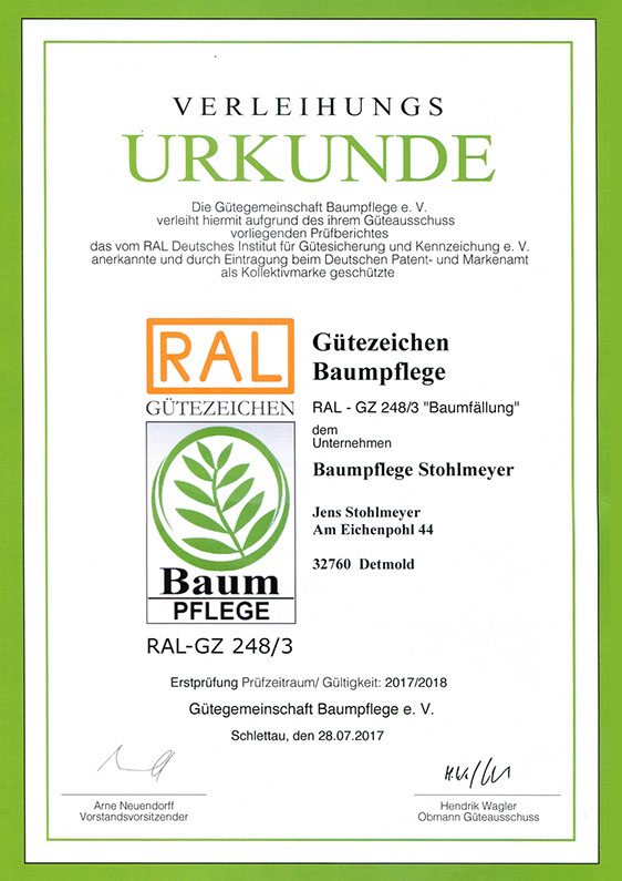 Wir haben uns von der Gütegemeinschaft RAL-Baumpflege zertifizieren lassen, um die Qualitätssicherung in unserer Branche zu forcieren. Es gibt zwar Bestrebungen, die Qualität der Baumarbeiten zu definieren, diese sind jedoch noch nicht ausreichend und transparent genug. So ist die Zusammenführung der vielen Regelungen zu einem Regelwerk der Gütebestimmungen das anvisierte Ziel. In den Richtlinien der RAL-Baumpflege werden die Qualitätsanforderungen wie fachgerechte Schnitttechniken, die Verwendung von ökologischen Betriebsmitteln oder auch die Sicherheit und Organisation von Arbeitsabläufen zusammenfassend festgelegt.